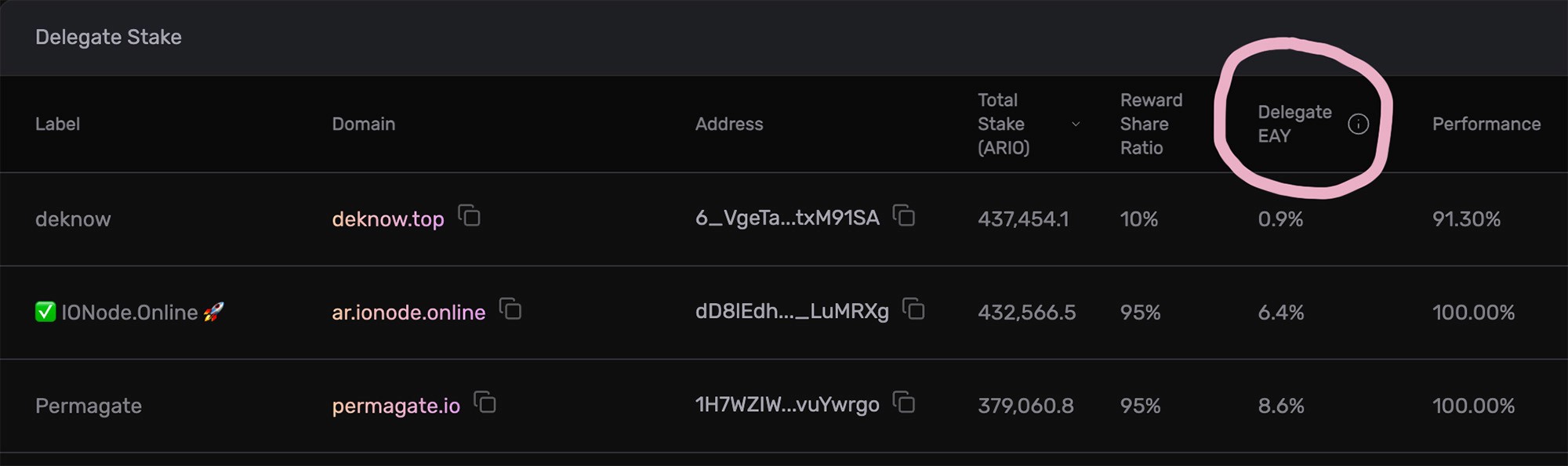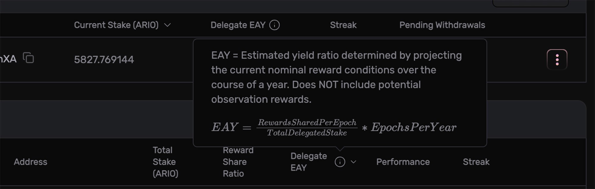 Understanding Delegate Effective Annual Yield (EAY) for ARIO staking: how to calculate it, what affects it, and how to use it when choosing gateways.