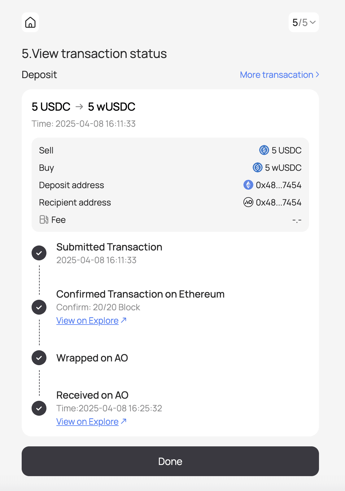 Wait ~30 minutes for the process to complete—wUSDC (wrapped USDC) will appear in your Wander wallet.