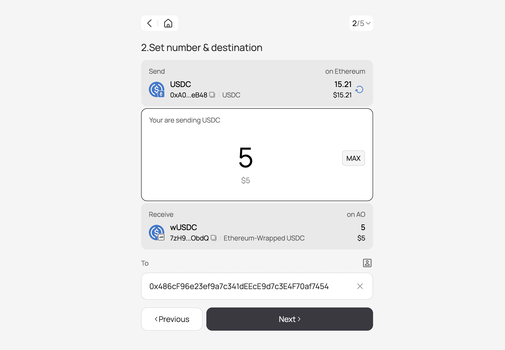 Select USDC on Ethereum as your source asset and your Wander wallet as the destination.