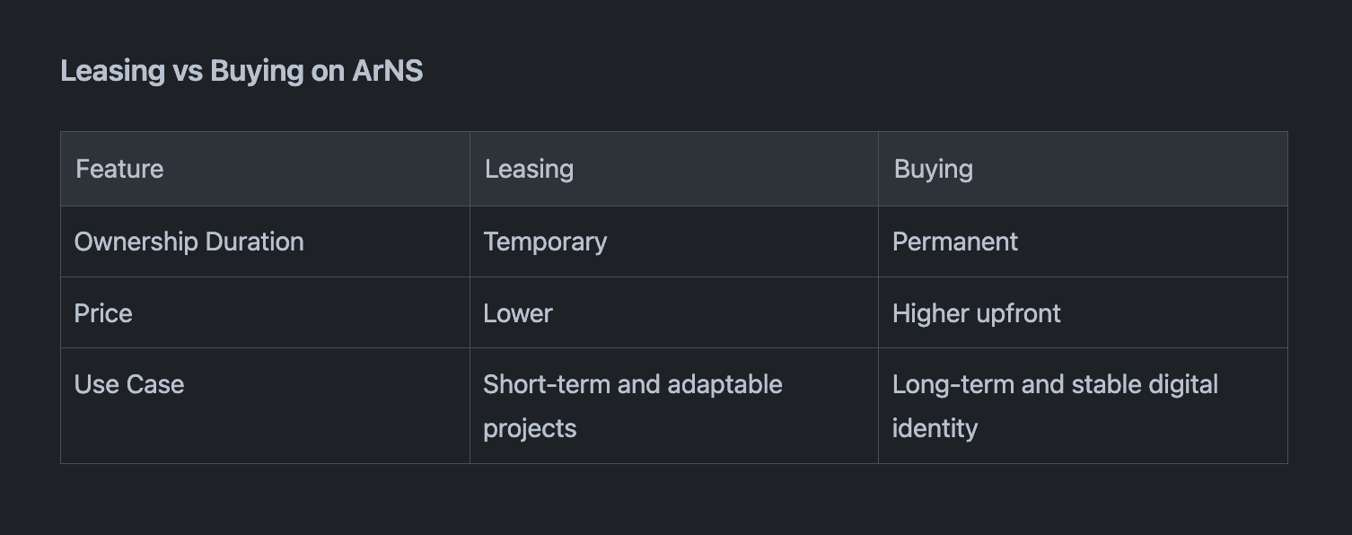 Understanding the difference between leasing and permanently buying ArNS names: when to choose flexibility versus lifetime ownership.