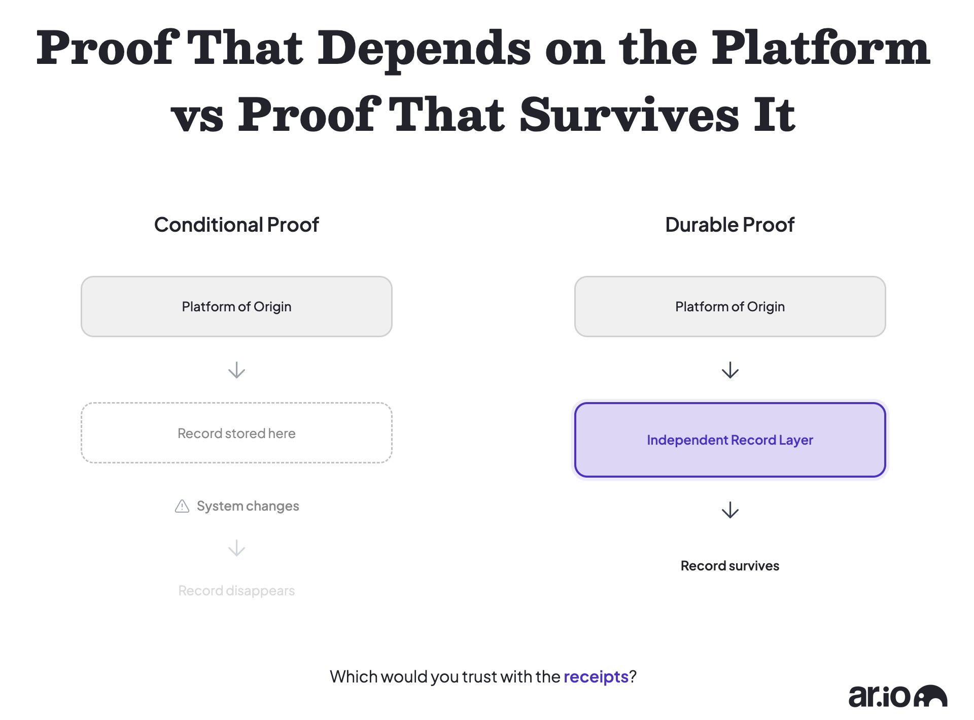 Most receipts today live inside the same platforms that generate the outputs, inheriting those platforms' finite lifecycles. When systems evolve, migrate data, undergo API changes, or switch vendors, the evidence often vanishes. This fragility matters far more than it first appears.