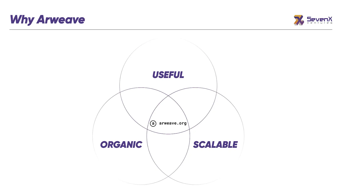 A helpful diagram from SevenX ventures breaks Arweave into three components: Useful, Scalable, and Organic.